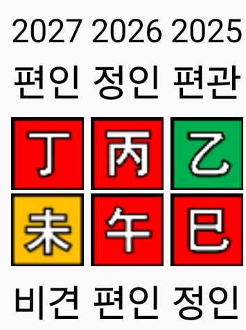 2025년부터 3년간 들어오는 화오행은 기유일주에게 식신의 힘이 줄어들고 인성의 힘이 강해지는 시기 입니다. 편인에 의해 식신이 도식되는 2026년 하반기와 2027년 상반기는 자신의 재능이 줄어들어 비겁에 의한 재물손실이 이어질 수 있으니 주의해야 하는 시기 입니다.