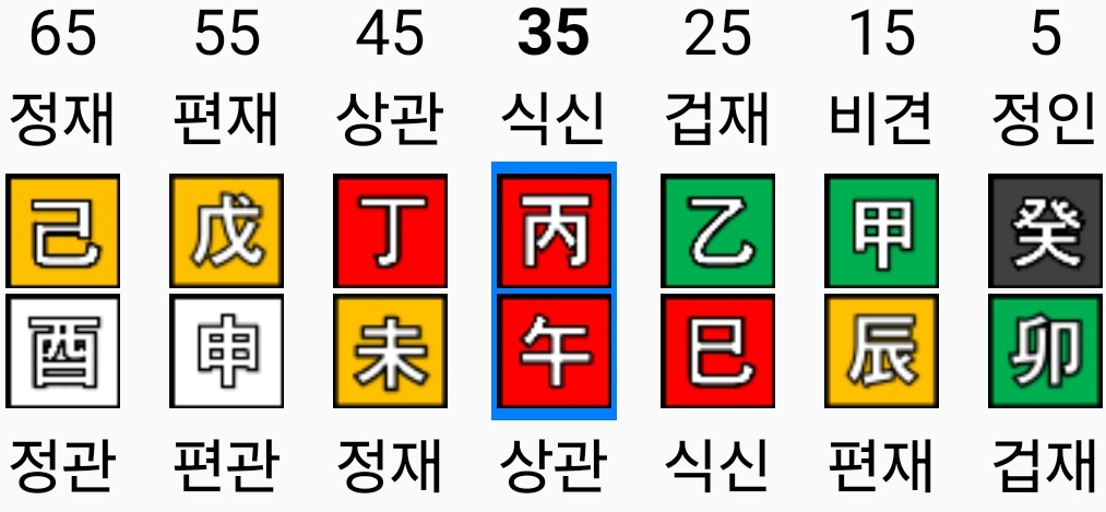 가수 장기하 사주의 대운을 보면 봄에 태어나서 여름 가을로 가는 대운 순행 사주입니다. 현재는 여름 대운을 지나고 있어 식신과 상관대운으로 자신의 재능과 특기를 활용하여 사회활동을 하는 시기입니다.