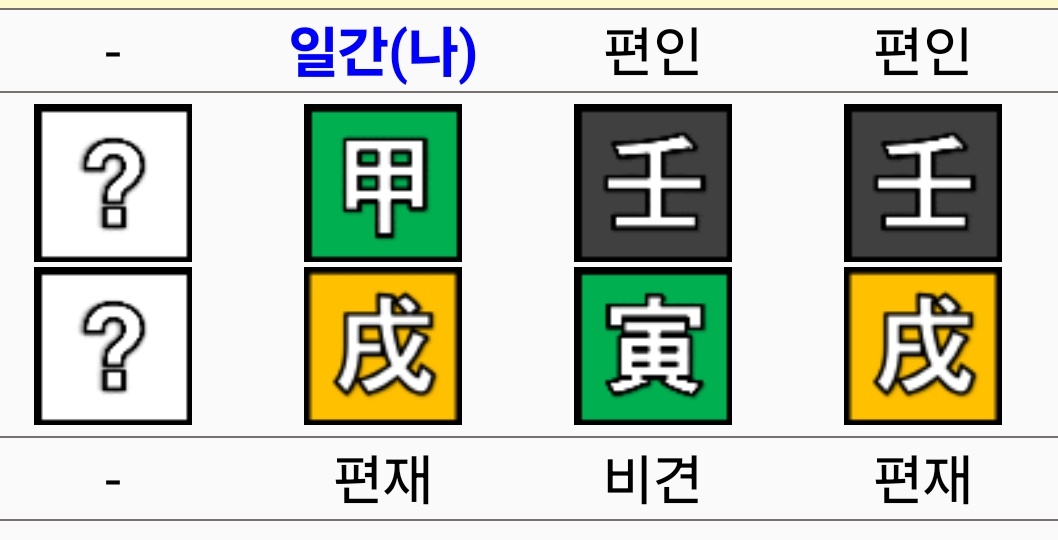 연간과 월간의 임수 편인은 천간 갑목에 끊임없는 물을 공급하여 갑목을 성장시킵니다.