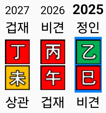 2025년 을사년, 2026년 병오년, 2027년 정미년에 병술일주는 다음과 같은 운을 맞이하게 됩니다.