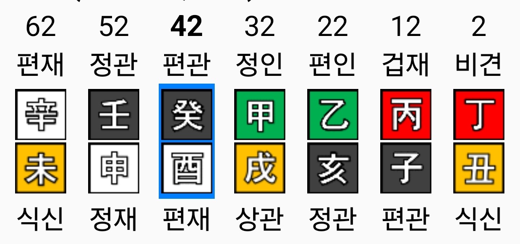 겨울에 태어나서 현재는 가을의 왕지인 42 계유대운에 있습니다. 상관은 편관을 제압하여 개그맨 이수근에게는 좋은 호기입니다. 52 임신대운은 월지에서 인신충이 발생하고 바다와 같은 임수정관과 무토상관이 상관견관을 하게 됩니다. 일단 을사년부터 일지에서 사해충과 월지에서 인사형이 발생합니다. 어머니와의 관계와 자식과의 관계를 잘 보듬어야 하는 시기입니다.