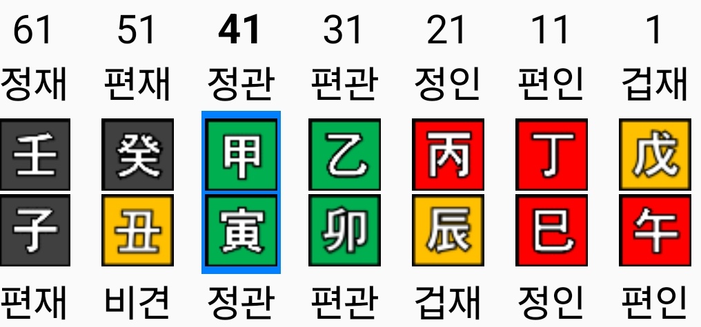 가수 김희철의 대운을 보면 대운 역행 사주 입니다. 여름의 고지인 미월에 태어나 역행하면서 편인과 정인으로 구성된 인성대운 30년을 보냈습니다. 인성운은 문서나 계약을 의미하기도 하지만 자격을 갖추는 구간이기도 합니다. 인성대운을 거치면서 가수 김희철은 자격을 갖추게 되는데 특히 11 정사대운 말미인 사화 정인구간과 21 병진대운 초입인 병인 정인구간에서 인생의 전환점이 되는 기회를 맞이하게 됩니다. 이 시기에 청소년 드라마에 출연을 시작하고 슈퍼주니어 멤버로 발탁이 됩니다.